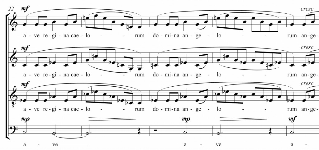 SATB chorus, latin text, 6 minutes. Commissioned by the Cantata Singers of Ottawa. First performance: The Cantata Singers of Ottawa, Michael Zaugg, conductor, Stabat Mater Concert, 31 March 2010, Christ Church Cathedral, Ottawa. Press As… Read more: Ave Regina Caelorum - concerto GROSSO